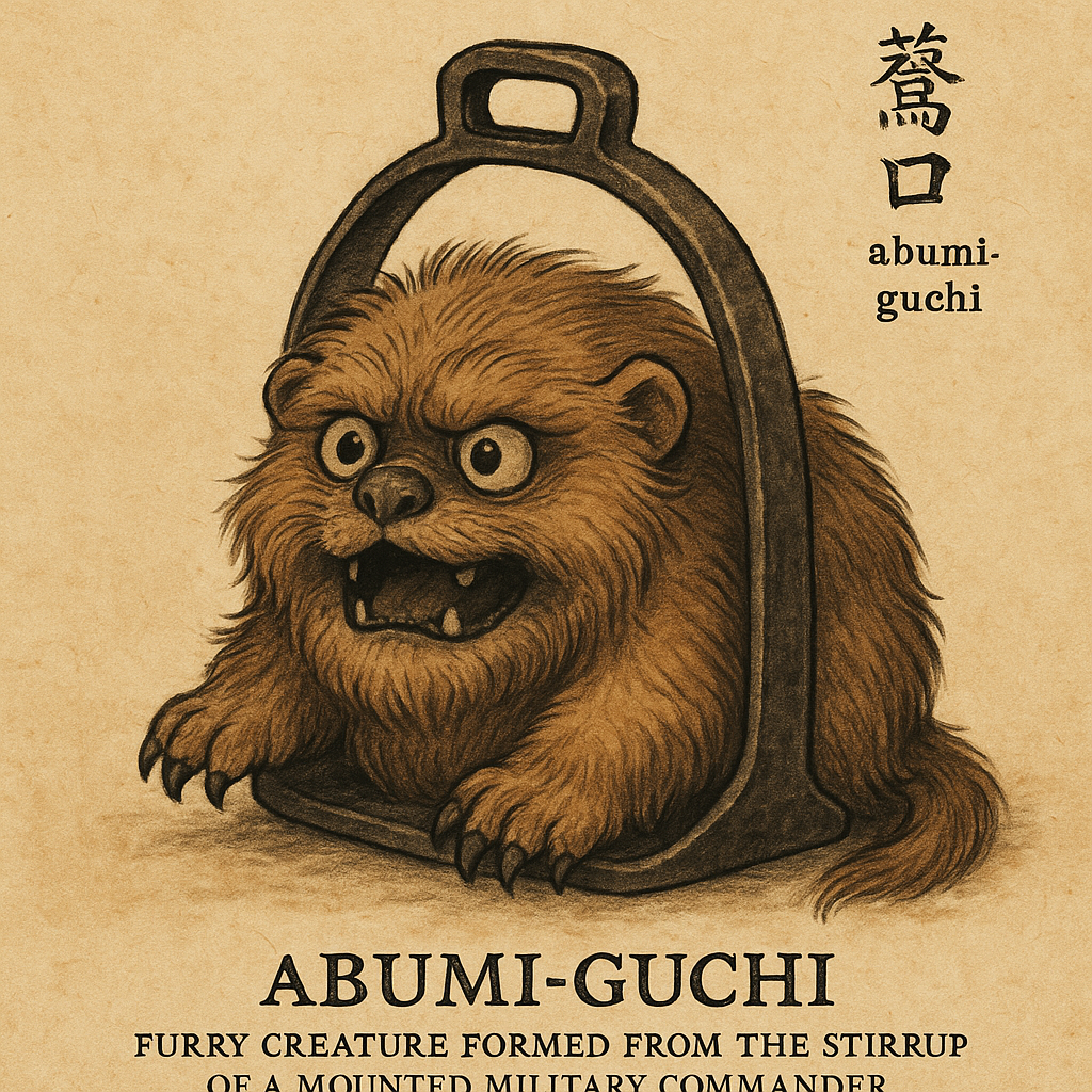 The Abumi-guchi is a small, furry yōkai that is said to be formed from an abumi—a traditional Japanese stirrup used by mounted samurai. Specifically, it arises from the stirrup of a fallen warrior, one who died in battle and never returned to reclaim his gear.