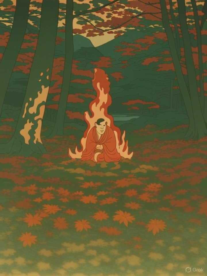 - Within the flame, the faint silhouette of a monk—often bald, in robes, and holding prayer beads or a staff—can sometimes be seen.