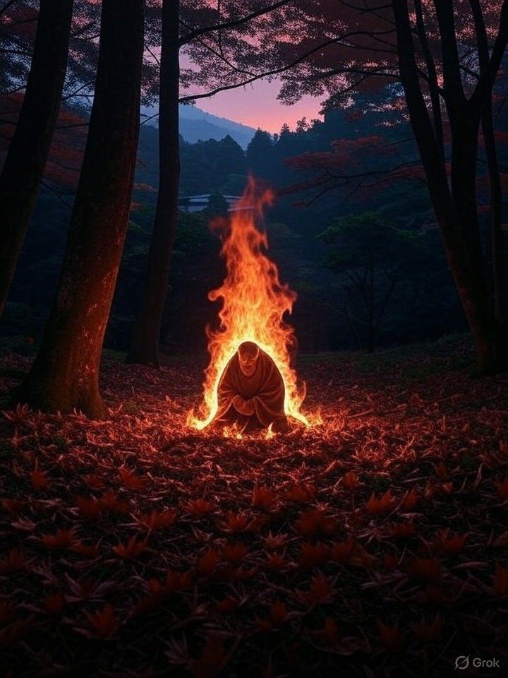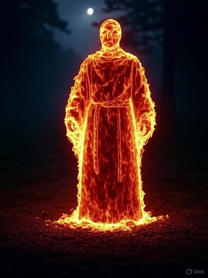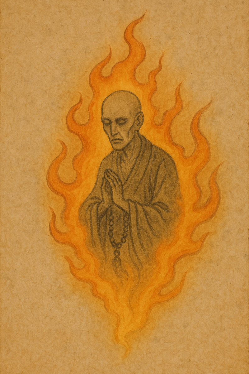 - Within the flame, the faint silhouette of a monk—often bald, in robes, and holding prayer beads or a staff—can sometimes be seen.